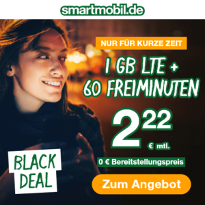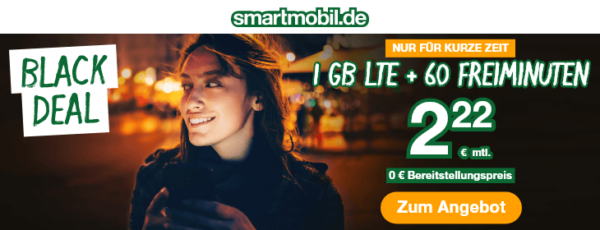 Bei Smartmobil bekommt ihr als Black Deal 1GB LTE + 60 Minuten für 2,22€/Monat, täglich kündbar.