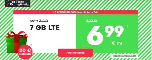Bei Handyvertrag.de, einer Marke der Drillisch AG (SIM.de, Simply & Co.), erhaltet ihr die 7 GB LTE Allnet-Flat für 6,99€/Monat (auch ohne Vertragslaufzeit!). 🙂