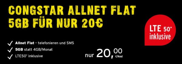 - Surfen: 5 GB LTE Internet-Flatrate (Mit bis zu 50 MBit/s, danach 32 KBit/s)