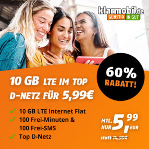 Neues Angebot von klarmobil, diesmal bekommt ihr einen Minutentarif mit 10GB LTE + 100 Frei-Minuten + 100 Frei-SMS im Vodafone-Netz für 5,99€/Monat