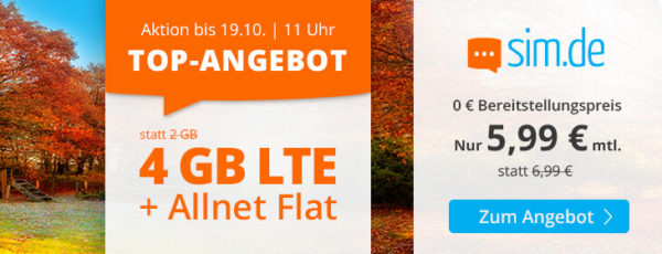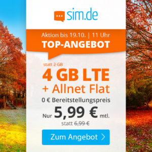 Bei SIM.de, einer Marke der Drillisch AG (Handyvertrag.de, Simply & Co.), erhaltet ihr die 4GB LTE Allnet-Flat für 5,99€/Monat (auch ohne Vertragslaufzeit!). 🙂