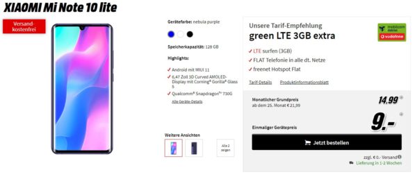 Gutes Smartphone inkl. Tarif gesucht? Bei MediaMarkt Tarife bekommt ihr gerade das Xiaomi Mi Note 10 Lite inkl. 3GB LTE + Telefon-Flat + Hotspot-Flat im Vodafone-Netz für 14,99€/Monat