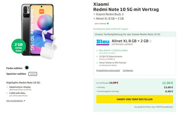 *TIPP* Xiaomi Redmi Note 10 5G + Redmi Buds 3 + 10 GB LTE + Alles-Flat im o2-Netz für 12,99€/Monat – Effektiv 2,99€/Monat