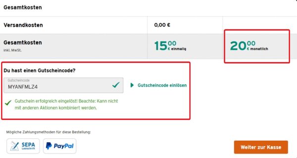 - Anschlussgebühr 35€ bei der monatlich kündbaren Variante, 15€ bei 24 Monaten Laufzeit.