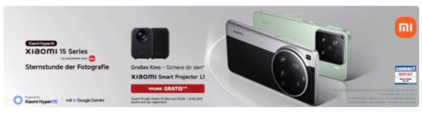 Zum Xiaomi 15 gibt es aktuell einen gratis Projektor dazu. Dieser Projektor names „Xiaomi Smart Projector L1“ ist kompakt und leicht, wodurch er sich gut für den mobilen Einsatz eignet.