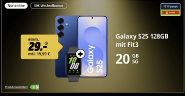 Richtig starker Deal seitens MediaMarkt, dort bekommt ihr das Samsung Galaxy S25 + Fit3 Fitnesstracker + 20GB 5G + Alles-Flat im Telekom-Netz für 19,99€/Monat