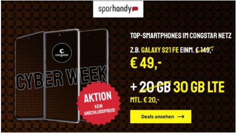 Bei Sparhandy findet ihr jetzt ebenfalls ein Special mit dem Congstar 30GB LTE Tarif: Die Grundgebühr beträgt 20€ im Monat und es gibt verschieden Smartphones zu super Preisen dazu! Ich bin selbst Congstar Kunde und kann im LTE-Netz kaum einen Unterschied zu original Telekom feststellten (da war ich zuvor). Daher geht für das Netz eine 100%ige Empfehlung raus!