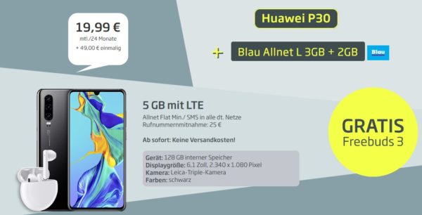 *TOP* Huawei P30 + 5GB LTE + Telefon- & SMS-Flat + Freebuds 3 im o2-Netz für 19,99€/Monat – effektiv 0,87€/Monat