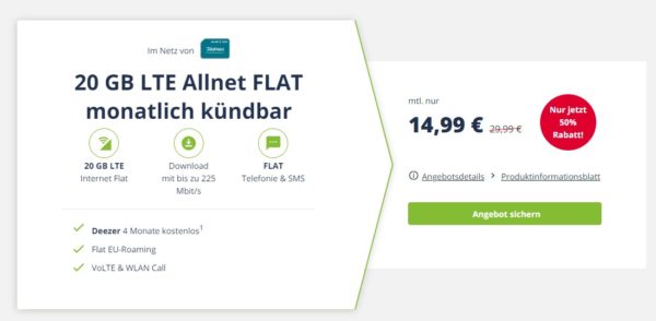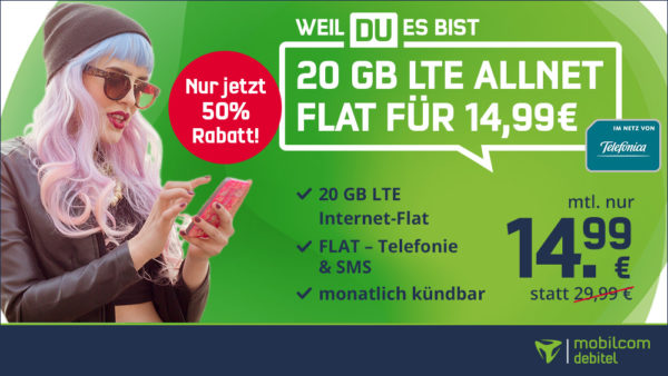 Krasses Angebot bei mobilcom-debitel, dort gibt es den O2 green LTE 20 GB für 14,99€/Monat. 🙂