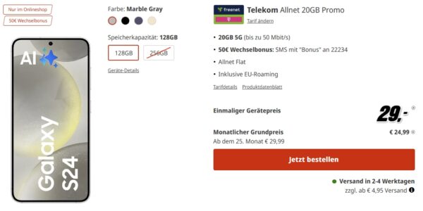 Bei MediaMarkt gibt es derzeit das Samsung Galaxy S24 + 20 GB Telekom LTE AllnetFlat für eff. -1,30€/Monat. 🙂