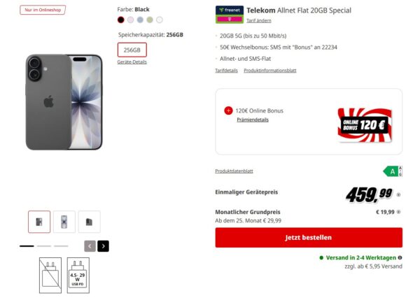 Starker Deal seitens MediaMarkt zum Start in das Wochenende, bei MediaMarkt bekommt ihr das Apple iPhone 17 256GB + 20GB 5G + Alles-Flat im Telekom-Netz für 19,99€/Monat