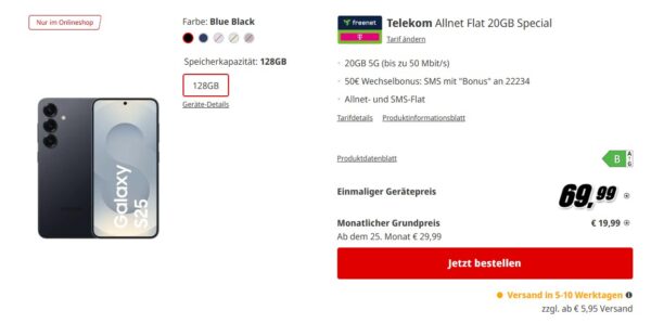 Richtig schönes Angebot zum Wochenstart, bei MediaMarkt bekommt ihr das Samsung Galaxy S25 128GB + 20GB 5G + Alles-Flat im Telekom-Netz für 19,99€/Monat