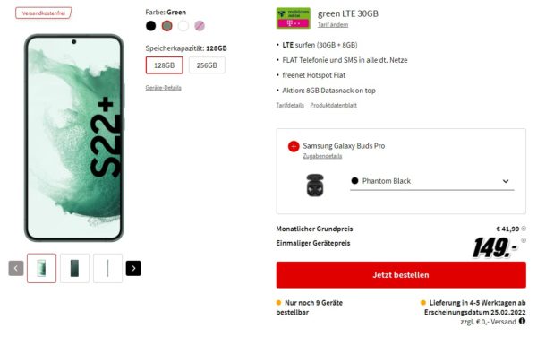 Bei MediaMarkt bekommt ihr das Samsung Galaxy S22+ (149€) inkl. 38 GB LTE + Telefon-Flat + Hotspot-Flat für 41,99€/Monat + gratis Galaxy Buds Pro