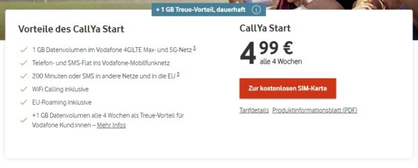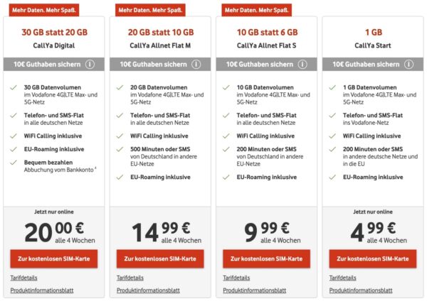 Wer gerade nach einem guten Prepaid Angebot sucht der erhält nun bei Vodafone die beliebten CallYa Tarife zu attraktiven Konditionen. Abgerechnet wird hierbei alle 4 Wochen. Wer wechselt und seine Rufnummer mitnimmt erhält einen Bonus von 10€ on top! Außerdem erhält man als Festnetz-Kunde 1 GB Datenvolumen zusätzlich. 🙂