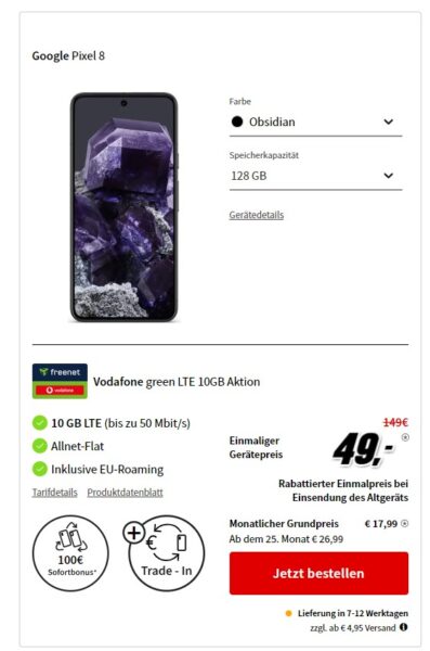 *TRADE IN EFF. GRATIS* Google Pixel 8 + 10GB LTE + Telefon-Flat im VF-Netz für 17,99€/Monat