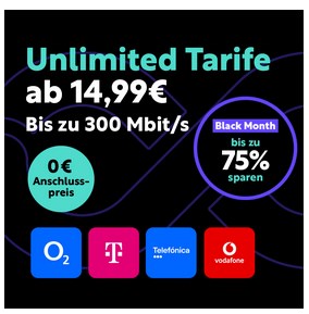🔥 *BLACK-DEALS JETZT OHNE AG* Unlimited Mobile: Unbegrenztes Datenvolumen + Allnet-Flat ab 14,99€ ✅ in allen Netzen (o2, Telekom, Vodafone) ✅ monatlich kündbar!