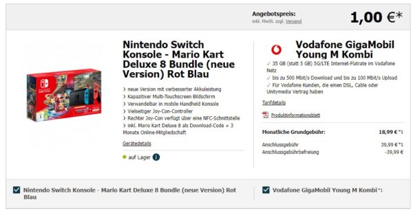Vodafone GigaMobil Young M Kombi Nintendo Switch Mario Kart Deluxe Bundle inkl. (35GB + Alles-Flat) für 18,99€/Monat – eff. 4€/Monat