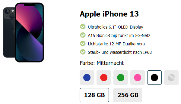 Denn bei LogiTel bekommt man den Vodafone Smart L+ Aktion GigaKombi-Vorteil-Tarif (Allnet, SMS, 40 GB LTE) inkl. Apple iPhone 13 (128 GB) für 34,99€/Monat – eff. 6,36€/Monat.