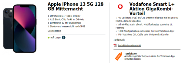 *EFF. 6,36€/MONAT* Vodafone Smart L+ Aktion GigaKombi-Vorteil-Tarif (Allnet, SMS, 40 GB LTE) inkl. Apple iPhone 13 (128 GB) für 34,99€/Monat