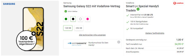 *EFF. 6,45€/MONAT* Vodafone Smart L+ Spezial Handy5 TradeIn-Tarif (Allnet, SMS, 25 GB LTE) inkl. Samsung Galaxy S22