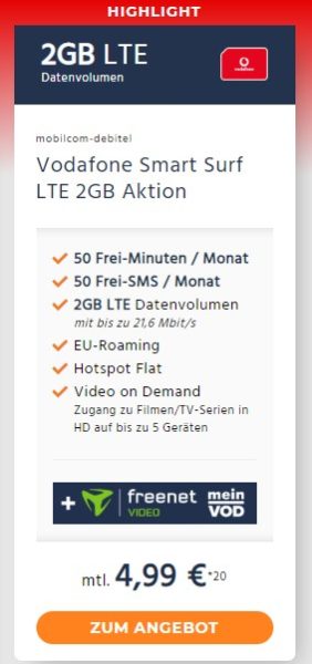 Vodafone Smart Surf 2GB LTE + 50 Minuten + 50 SMS inkl. freenet Video für 4,99€/Monat