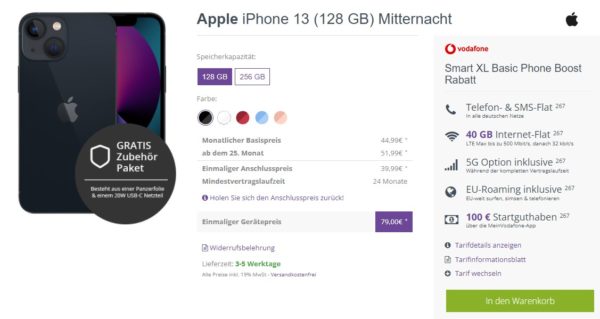 Fazit: Hier bekommt ihr das Apple iPhone 13 (128 GB) + 40 GB LTE + Alles-Flat im Vodafone-Netz für effektiv 12,07€/Monat.