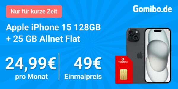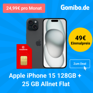 Neuer Weekend-Deal seitens Gomibo, dort bekommt ihr das Apple iPhone 15 128GB + 20GB 5G + Alles-Flat im Vodafone-Netz für 29,99€/Monat
