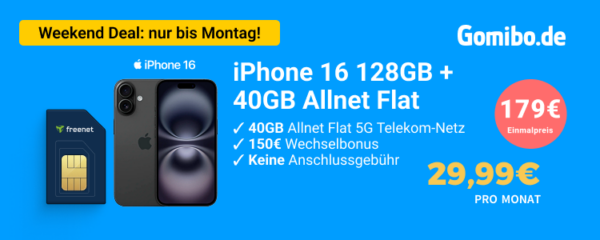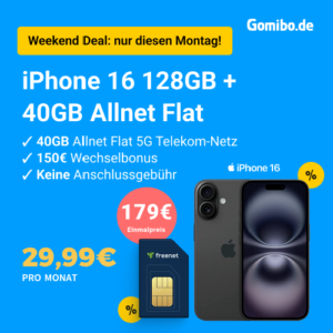 Bei Gomibo ist gerade ein neuer Weekend-Deal mit dem Apple iPhone 16 + 40GB 5G + Alles-Flat im Telekom-Netz für 29,99€/Monat gestartet
