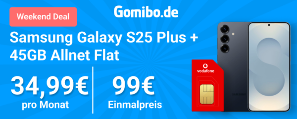 Starker Weekend-Deal seitens Gomibo, dort bekommt ihr das Samsung Galaxy S25+ Plus (512GB) inkl. 45GB 5G + Alles-Flat im Vodafone-Netz für 34,99€/Monat