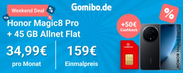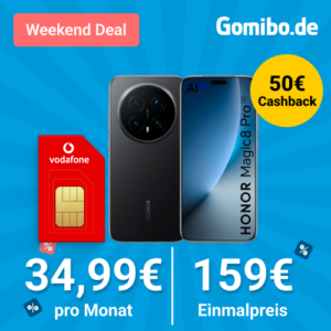 Neuer Weekend-Deal seitens Gomibo, dort bekommt ihr das Honor Magic8 Pro 512GB + 45GB 5G + Alles-Flat im Vodafone-Netz für 34,99€/Monat