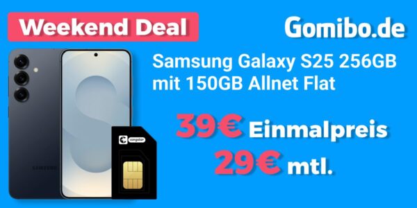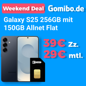 Als Weekend-Deal bekommt ihr bei Gomibo das Samsung Galaxy S25 (256GB) + 150GB 5G + Alles-Flat im Telekom-Netz für 29€/Monat