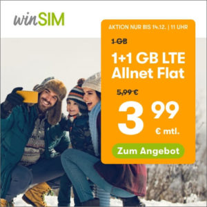 Bei WinSIM, einer Marke der Drillisch AG (SIM.de, Simply & Co.), erhaltet ihr die 2 GB LTE Allnet-Flat für 3,99€/Monat (auch ohne Vertragslaufzeit!).
