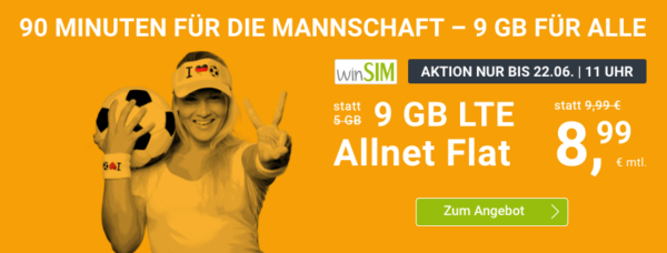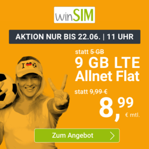Bei WinSIM, einer Marke der Drillisch AG (SIM.de, Simply & Co.), erhaltet ihr die 9 GB LTE Allnet-Flat für 8,99€/Monat (auch ohne Vertragslaufzeit!).