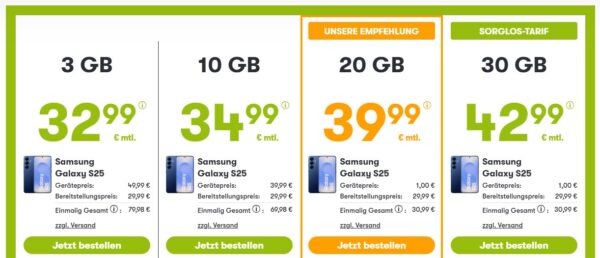 Bei winSIM könnt ihr euch jetzt das Samsung Galaxy S25 (256GB) + 20GB 5G + Alles-Flat für 39,99€/Monat sichern.