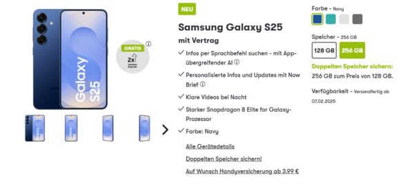 winSIM: Samsung Galaxy S25 (256GB) + 20GB 5G + Alles-Flat für 39,99€/Monat – eff. 1,52€/Monat