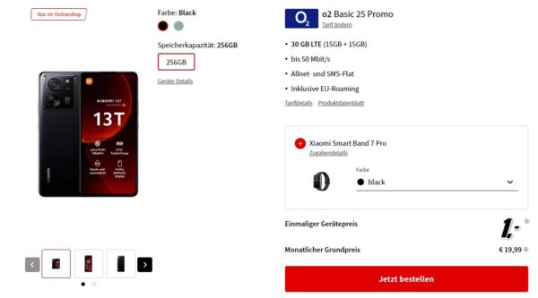 Xiaomi 13T (256GB) + Xiaomi Smart Band 7 Pro + 30GB LTE + Alles-Flat im o2-Netz für 19,99€/Monat – eff. 1,90€/Monat
