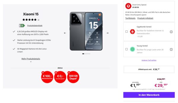 Xiaomi 15 512GB + 25GB 5G + Alles-Flat im Vodafone-Netz für 29,99€/Monat – eff. 0,12€/Monat