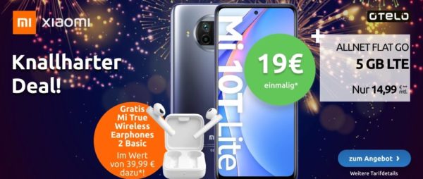 Xiaomi Mi 10T Lite + Wireless Earphones + 5 GB LTE + Alles-Flat im Vodafone-Netz für 14,99€/Monat – Effektiv 3,08€/Monat