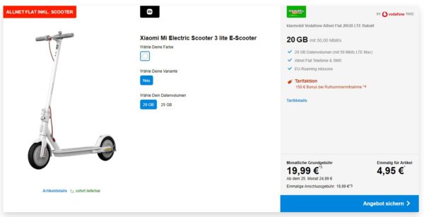 Nice! Schönes Angebot seitens handytick, dort bekommt ihr den Xiaomi Mi Electric Scooter 3 lite E-Scooter + 20GB LTE + Alles-Flat im Vodafone-Netz für 19,99€/Monat