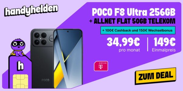 Schöner Deal von Handyhelden, dort bekommt ihr das Xiaomi POCO F8 Ultra 256GB + 50GB 5G + Alles-Flat im Telekom-Netz für 34,99€/Monat