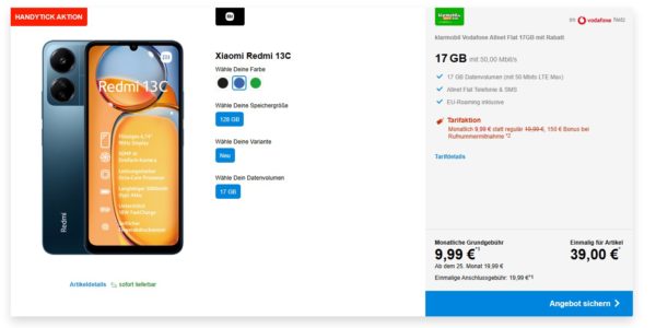 Nice! Bei handytick bekommt ihr das Xiaomi Redmi 13C + 17GB LTE + Alles-Flat im Vodafone-Netz für 9,99€/Monat