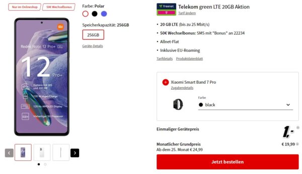 Xiaomi Redmi Note 12 Pro+ 5G + Smart Band 7 Pro + 20GB LTE + Telefon-Flat im Telekom-Netz für 19,99€/Monat – eff. 4,86€/Monat