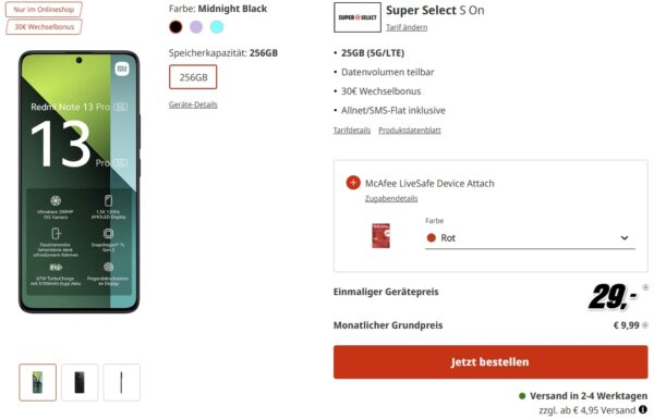 Bei MediaMarkt erhaltet ihr derzeit das XIAOMI Redmi Note 13 Pro 5G + 25 GB LTE/5G AllnetFlat für eff. 0,53€/Monat!