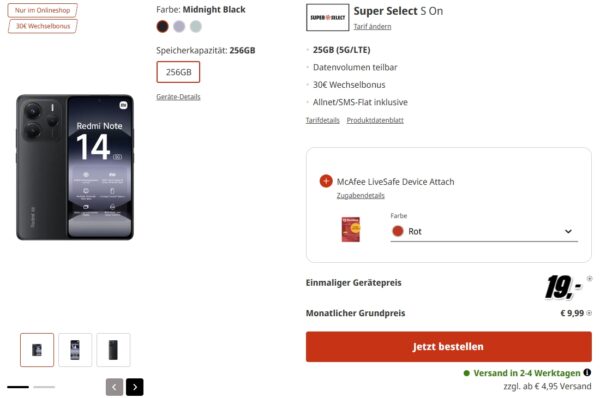 Bei MediaMarkt erhält man derzeit das Xiaomi Redmi Note 14 5G + 25 GB 5G AllnetFlat für 9,99€/Monat 🙂