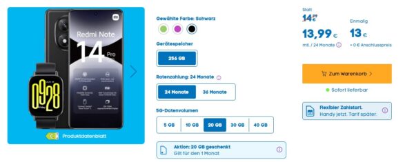 Xiaomi Redmi Note 14 Pro + Redmi Watch 5 Active + 20GB 5G + Alles-Flat im o2-Netz für 13,99€/Monat – eff. 4,20€/Monat