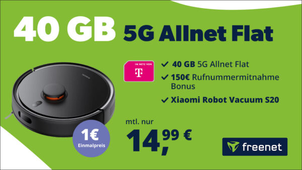 Zum Start in das Wochenende bekommt ihr den Xiaomi Robot Vacuum S20 + 40GB 5G + Alles-Flat im Telekom-Netz für 14,99€/Monat