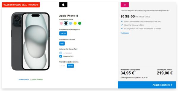 *YOUNG + MAGENTAEINS* Apple iPhone 15 (256GB) + 80GB LTE/5G + Alles-Flat im Telekom-Netz für 34,95€/Monat