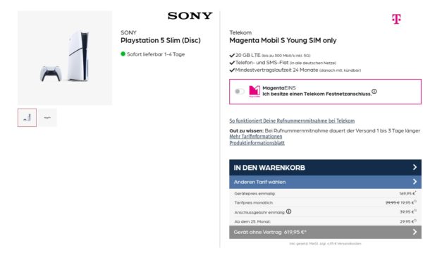 *YOUNG* Sony Playstation 5 Slim (Disc) + 20GB LTE/5G + Alles-Flat im Telekom-Netz für 19,95€/Monat – eff. 9,36€/Monat