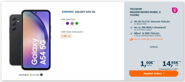 *YOUNG* Telekom MagentaEins Mobil S (40GB LTE/5G + Alles-Flat) + Galaxy A54 5G für 14,95€/Monat – eff. 3,36€/Monat