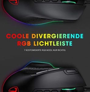 - Mit 16, 8 Millionen Chroma-Farben und 7 RGB-Beleuchtungsmodi für die kostenlose Anpassung und Anpassung bietet diese RGB-Maus mit einstellbarer Beleuchtungsgeschwindigkeit und -helligkeit eine größere Auswahl an Erscheinungsbildern. Die Beleuchtung kann auch ausgeschaltet werden, indem die Lichttaste 3 Sekunden lang gedrückt wird.
